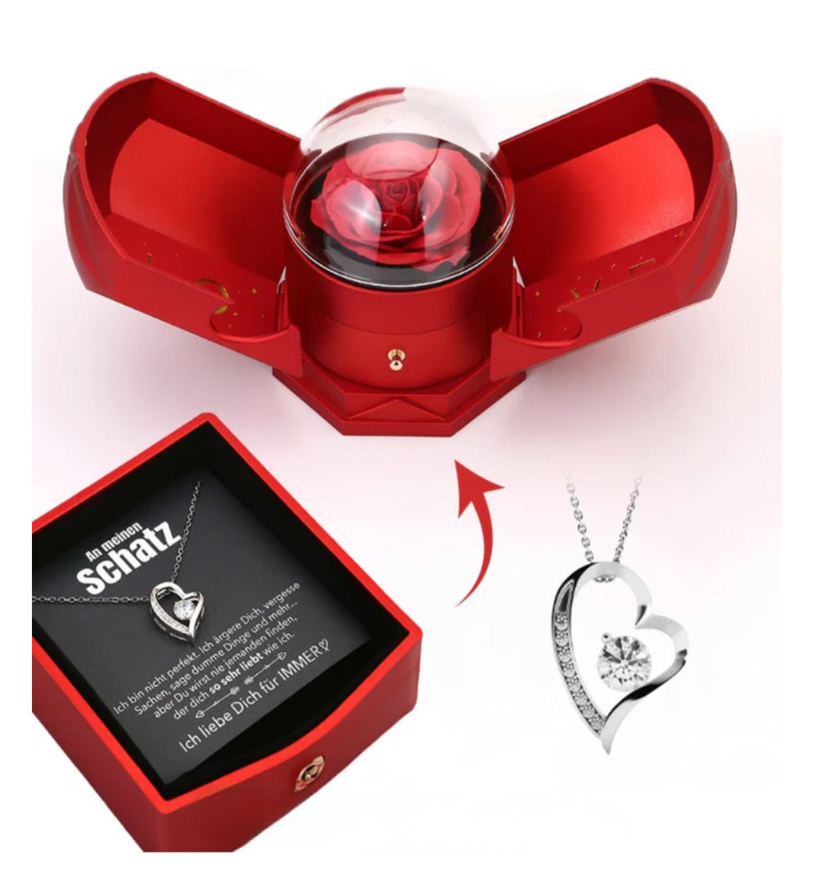 Ewige Rosenbox - Mit Herz Halskette & romantischer Notiz - An meinen Schatz